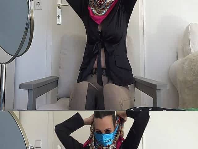In the silk and satin scarf fitting studio: trying on headscarves, neckerchiefs, scarf face mask Part 2