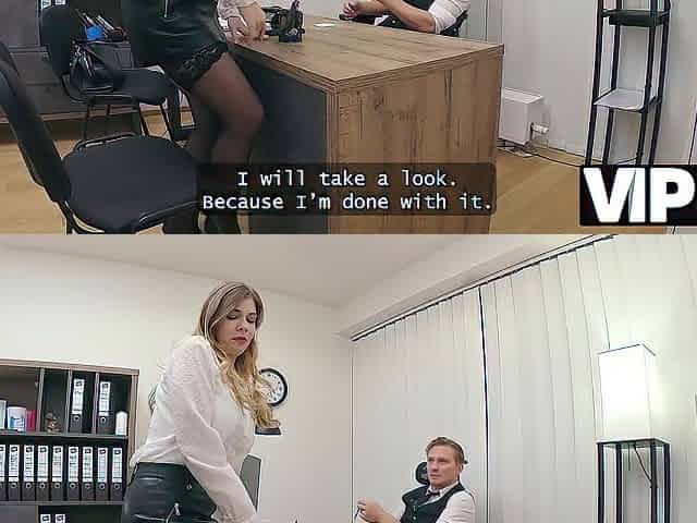VIP4K. Blond Maya with large melons is banging a bank worker on the office. Sexy interview with Maya