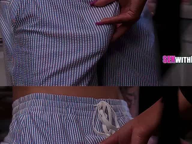 Meia-irmã sedutora usa calcinha sem fundo para facilitar o sexo.
