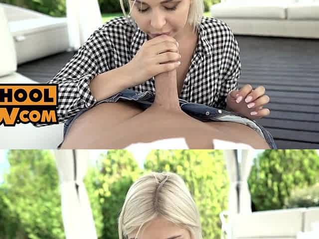 Sexy blonde gets seduced by guy with massive cock and fucks hard