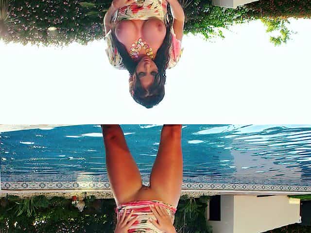 Big boobed brunette sex doll Nina Leigh performs hot wet solo in pool