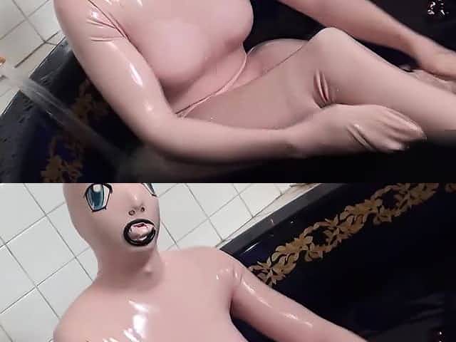Tanja takes a bath in her latex sex doll costume