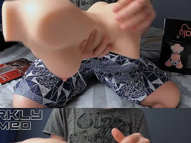 Big gay daddy bear jerking off black cock & cumming on sex doll close up