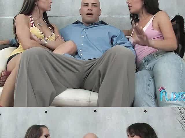 "Stud gets BJ from two nasty skanks then they share his sperm"
