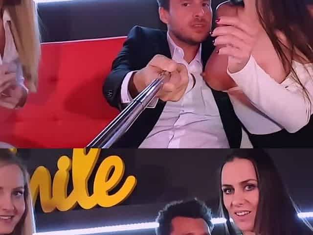 Blonde and brunette are filming themselves while sharing a guy