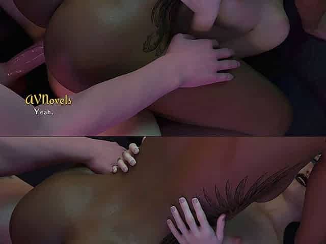 Shaved pussy game playthrough featuring hot brunette in a three-way