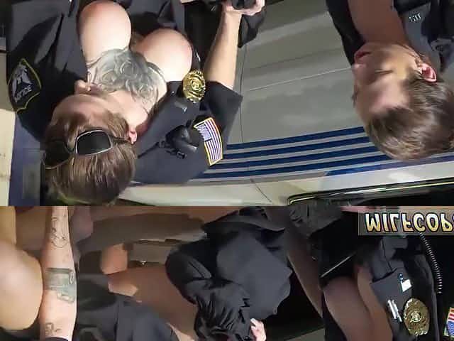 Two busty MILF cops sharing a black criminal outdoors in interracial threesome