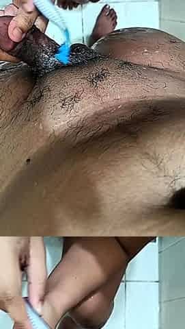 Shaving ramrod, balls and booty in shower. Hot masturbation