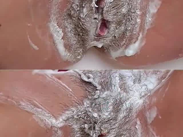 Shaving a hairy pussy with a trimmer and a razor with shaving foam!