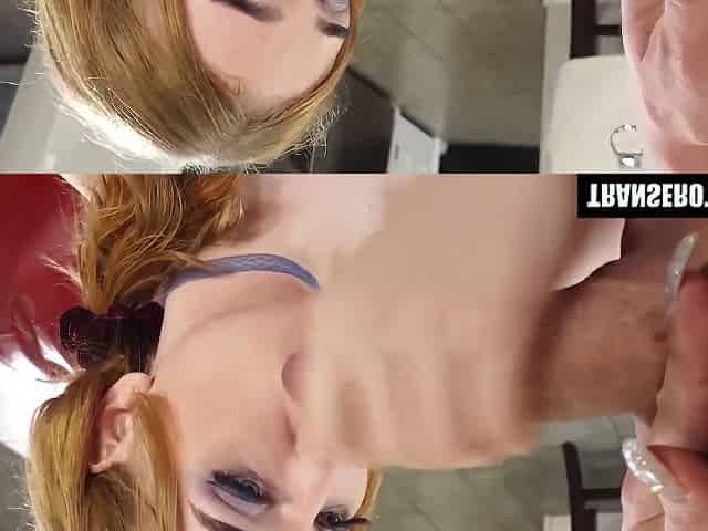 Blonde Trans Woman with an Extra-large Penis Fucks Throat and Pussy of a Trans Woman Until She Cums.