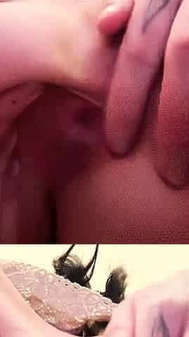 A female in white nylons engages in masturbation, gradually transitioning into doggy style anal-plug.