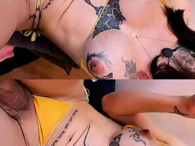 Tattood shemale tranny plays with ass during masturbation