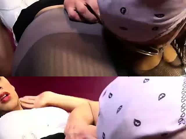 Feminine brunette shemale in gray pantyhose cums while