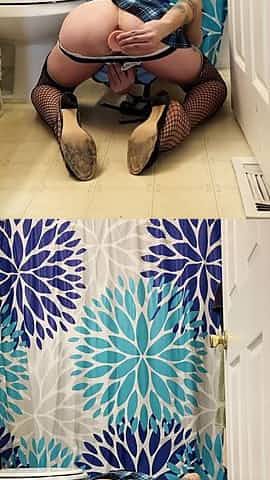 Long-legged Plugged Sissy Milk On Dresser Then Lick Her Own Cum