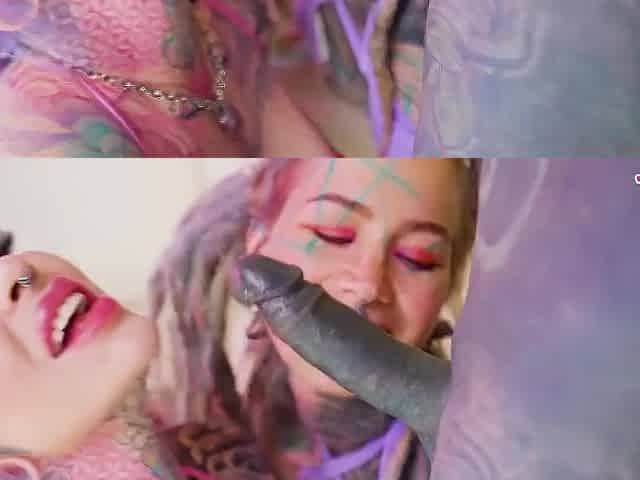 Tattooed Cuties Share a Hard Tattooed Shlong in Wild 3some