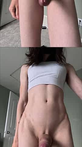Brunette ladyboy in jean shorts jerks off her big cock till