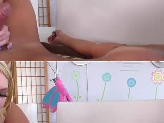 Trans beauty getting a tugjob by roomate whilst camming