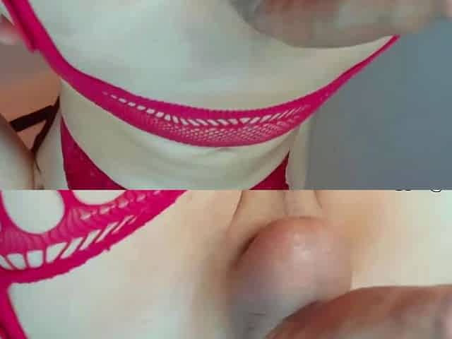 Trans stroking and making a mess on her lace brassiere