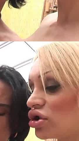 Real Amateur Lesbo pair share T-cutie top in delicious Trans 3some