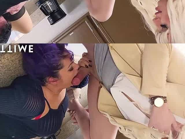2 large breasts ladyboys sucking off one wang after jerking themselves off