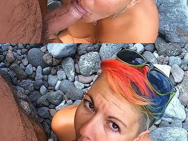 Short-haired tattooed girlfriend gives outdoor beach blowjob