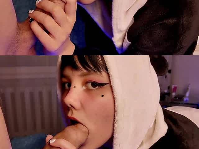 Panda girl with short hair made perfect blowjob for her bf's birthday