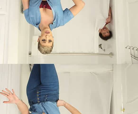 Curly redhead babe gets naked in the bathroom