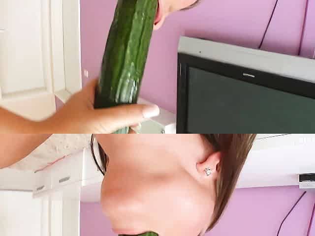 Passionate girlfriend Jennifer opens her shaved pussy for a cucumber