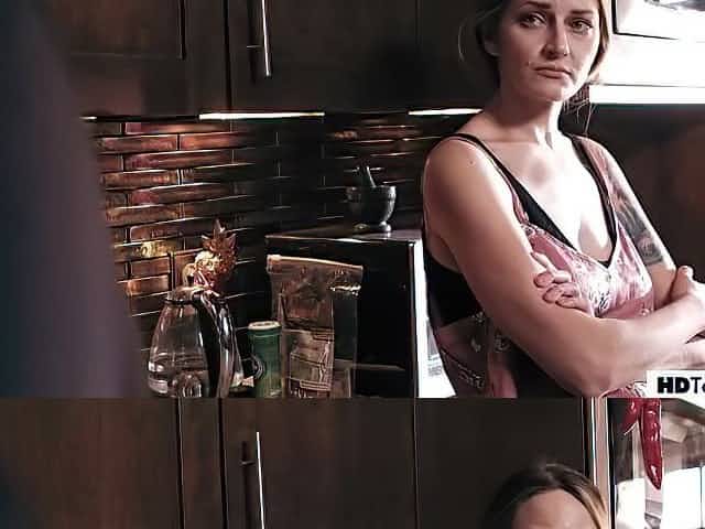 Short haired brunette hair, Brooklyn Gray is secretly having sex with her step- father, on the sofa