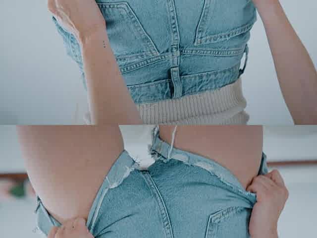 Amazing ass in sexy denim shorts gets pounded doggy style while getting a hot load on her belly