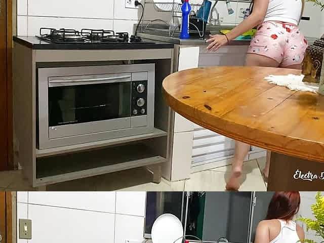 "Maid in short shorts cleaning the kitchen"