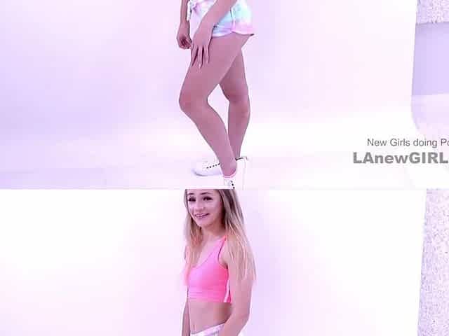 A girl with a perfect figure in a locker room trying on leggings and shorts