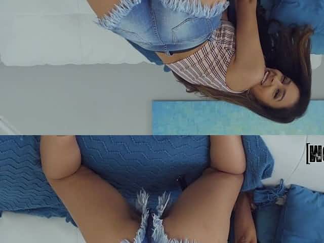 Brunette teen with small tits in shorts masturbating and ass fingering solo