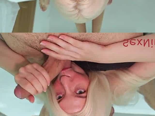 Cameron Canada with natural tits and shaved pussy sucking a dick