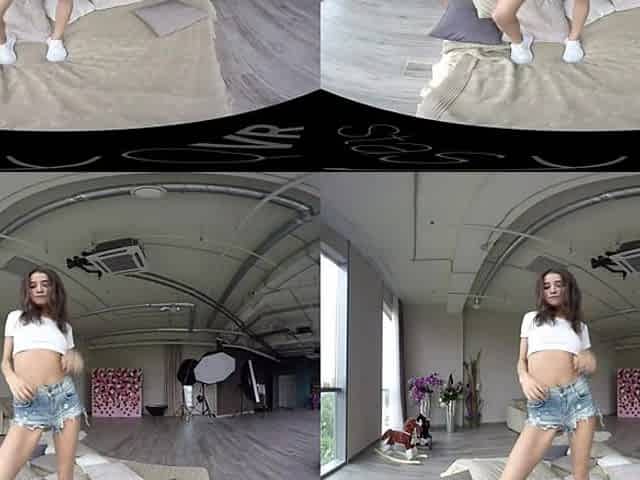 Small tits brunette Lily drops her shorts and uses a red dildo