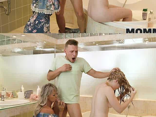 Rough FFM threesome on the bed with naughty Mom Grace and Ivy