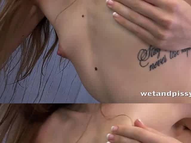 Teen with boobies jerking in the shower is spied on by a brunette.