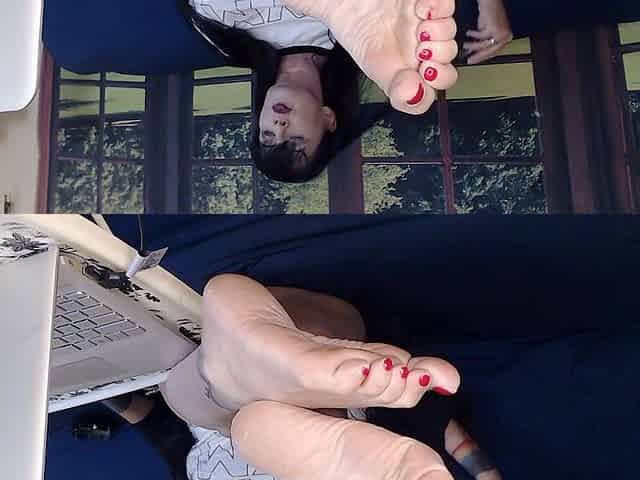 Milf Abby Anna shows off her red toenails and wrinkled soles while barefoot
