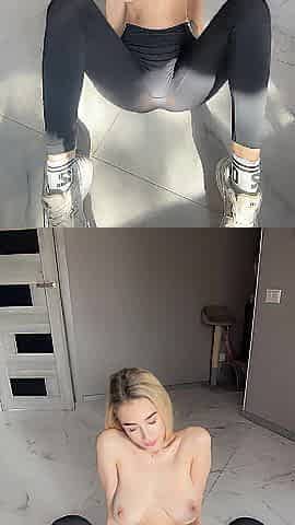 Small blond German chick shows merry tiny boobs and hirsute twat
