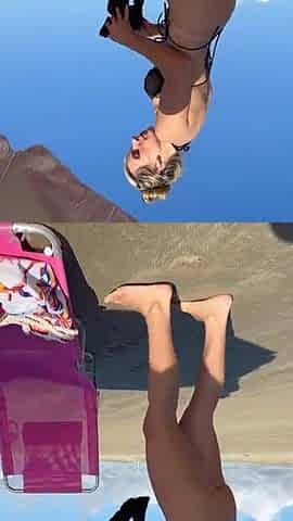 Marvelous blond woman in a transparent ebony bikini showing anything to her ally.