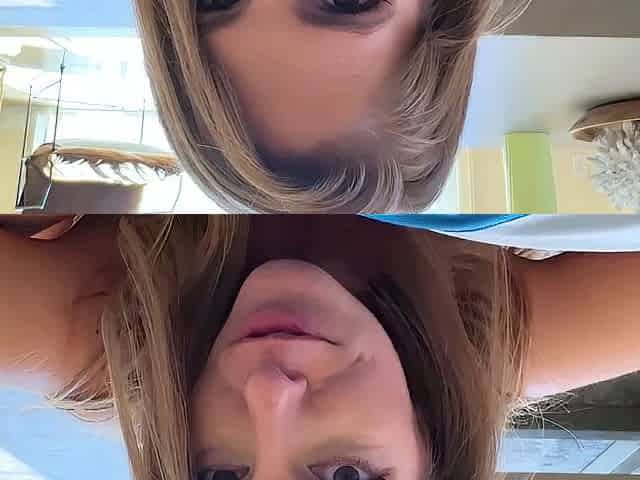 Young blonde takes her clothes off and shows you her huge fan bags