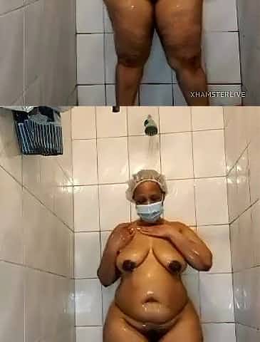 Black big beautiful woman is having a shower in front of the camera, just for the pleasure of it