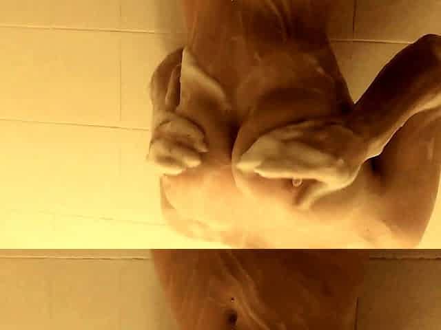 Mixed curvy hotty plays with tits, takes a soapy shower and uses dildo for solo groaning climax