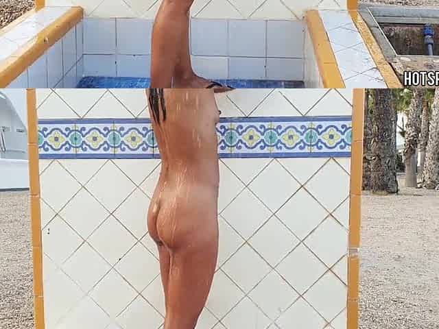 Hawt Brunette hair Taking a Undressed Shower on the Beach - Public Cunt Washing!