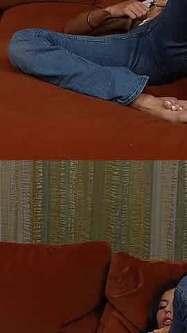 Busty curly brunette with big boobs fucks on couch