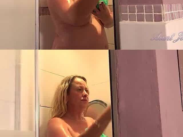 Juicy blonde with big natural tits courts Madam Knuckle in the shower before handsome man pays her a visit