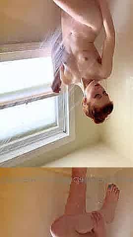 Redheaded woman shows off her big natural breasts and has fun with them in the shower