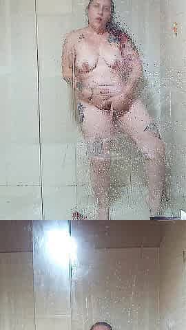 An aged woman is playfully engaged in a shower in advance of receiving jizz flow in her snatch