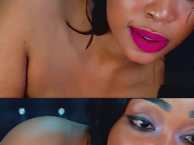 Shy young black brown eats ice-cream and flashes her scones on webcam