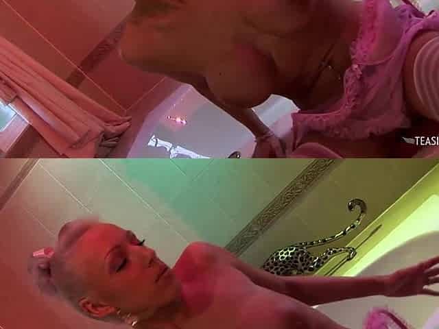 Breasty golden-haired beauties playing with a hard dong in the bathtub